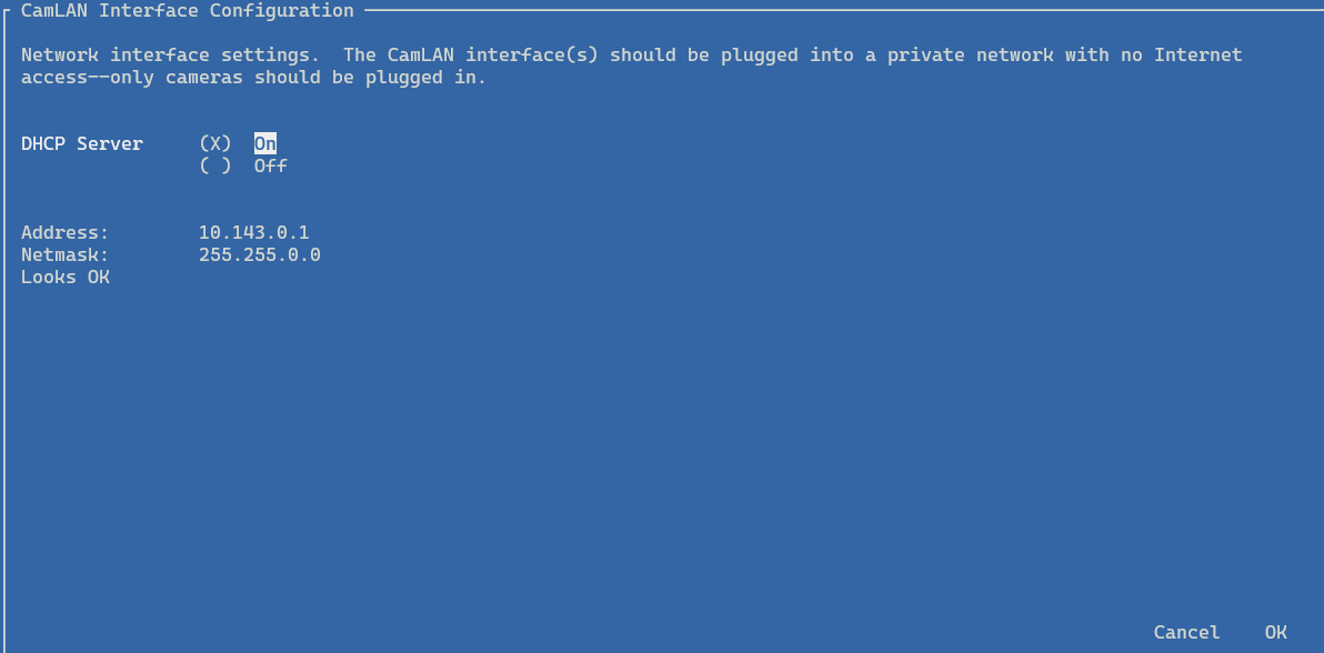 Most of the time, changing the CamLAN is not recommended because it complicates the implementation process. The CamLAN acts as a DHCP server to the cameras unless DHCP is turned off. The CamLan IP settings should only be changed if you are installing an Eagle Eye Bridge on an existing camera environment and the cameras are already set to a static network or; you are implementing Cloud Video Replication.