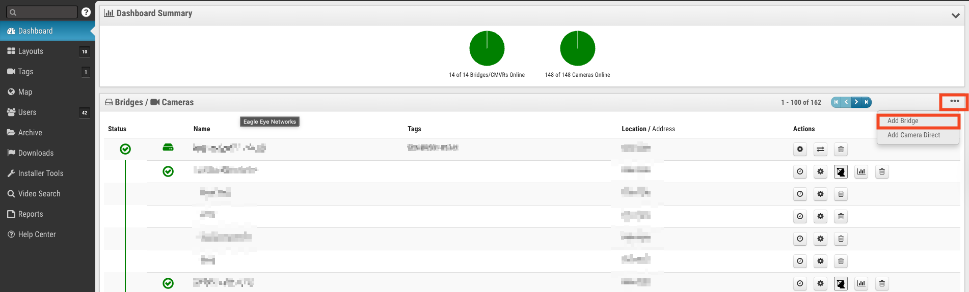 Each bridge scans the local network looking for ONVIF cameras. Cameras that can be added will show up in the “Available Cameras” section of the dashboard. You can click the green plus icon and the camera will be added to your account. The bridge will negotiate a connection and display previews once the camera is streaming. You can then go straight to camera settings.