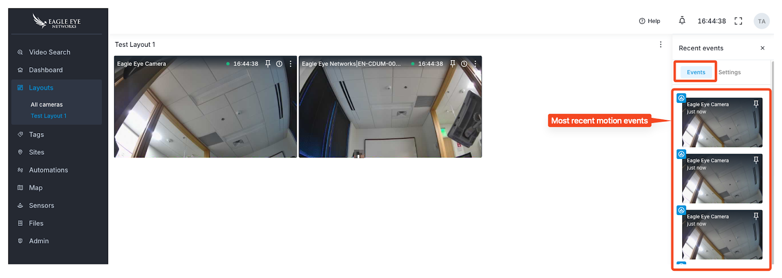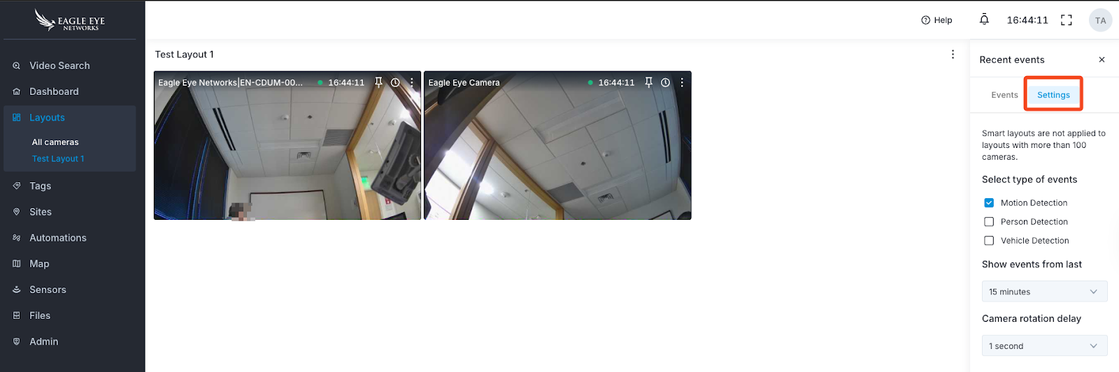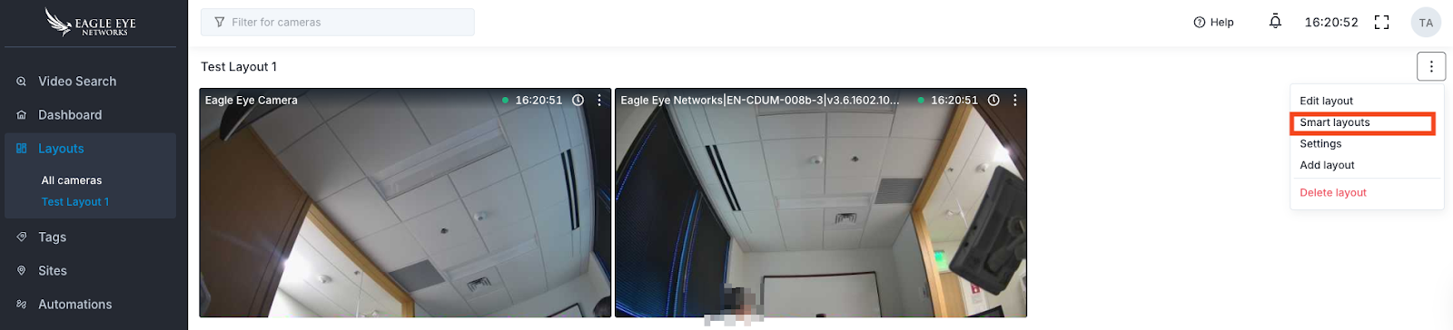 Smart Layouts use AI to automatically reposition cameras at the front of your layout that detect motion, people, or vehicles. Instead of manually scanning every camera, users can quickly focus on the most relevant activity. Each alert includes a preview you can click to jump directly to the recorded event. Smart Layouts are available only for Professional and Enterprise editions of the Eagle Eye Cloud VMS.