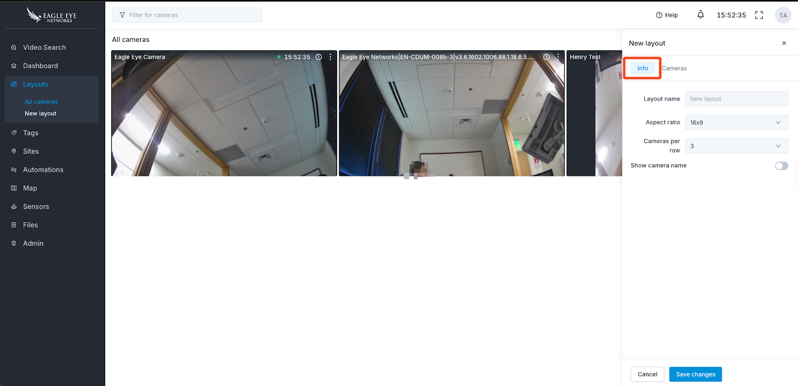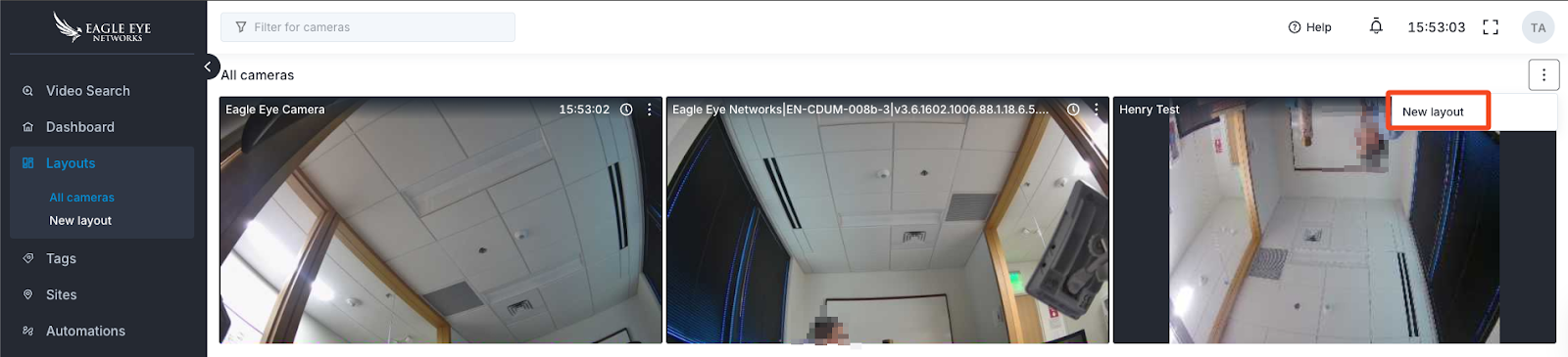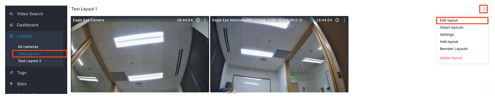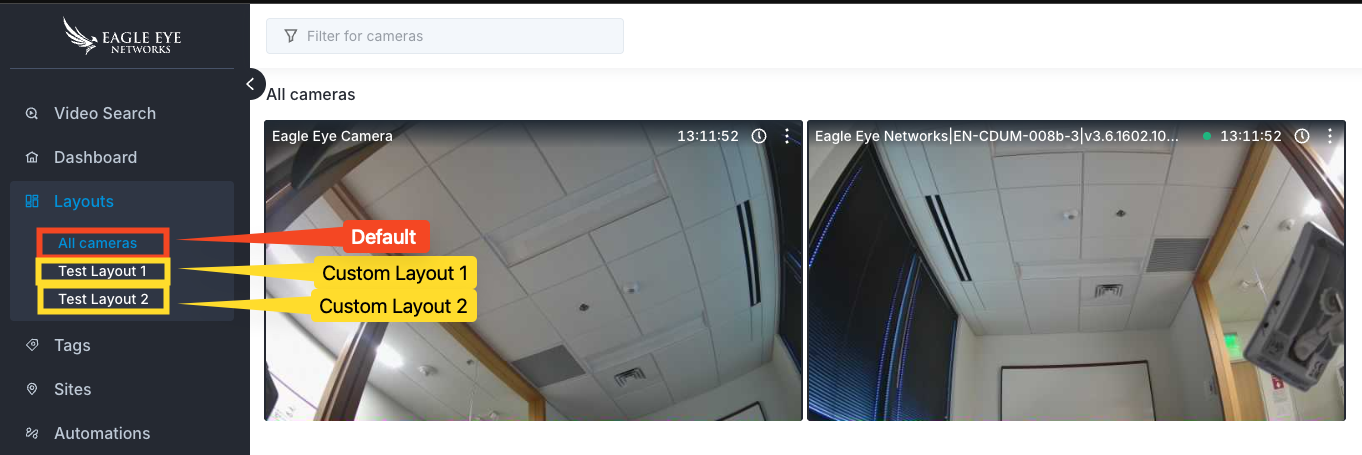 You will be provided with a default All Cameras layout. You will see a list of custom layouts you have created below the default layout under Layouts.Take note of the actions for each camera within a layout.