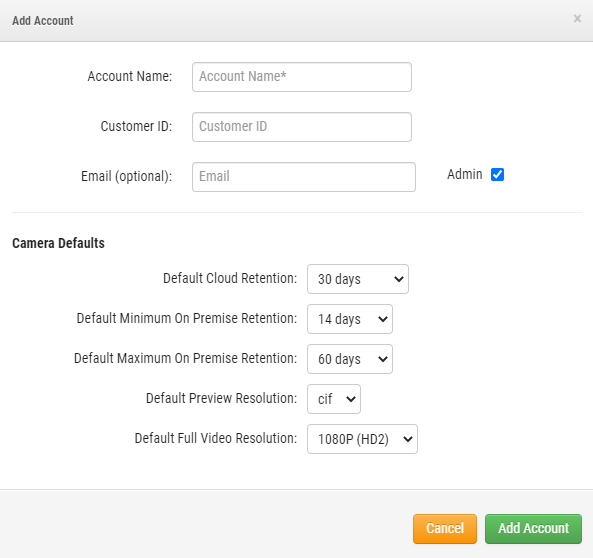 From this menu you can set the default settings for any new cameras that will be added to the system. The Customer ID is an optional field which can be filled out for internal organizational purposes but is not necessary.